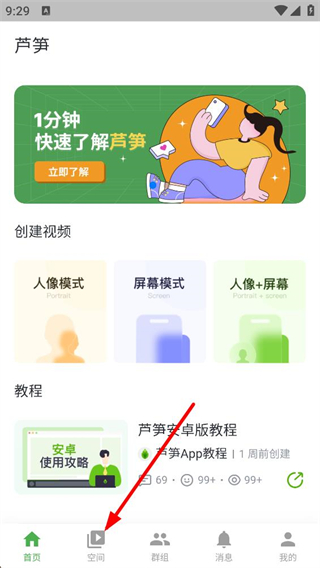 1、進入蘆筍首頁,可查看創建視頻的不同模式選項,點擊底部空間按鈕,進入空間功能對應的操作頁面。