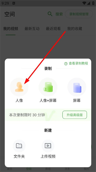 3、彈出的選項菜單里,選擇錄制分類下的人像選項,進入該模式對應的視頻錄制準備界面。