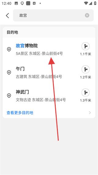 2、在搜索欄輸入目的地如故宮,可查看故宮博物院、午門、神武門等多個目的地選項,選擇故宮博物院進入路線規劃。