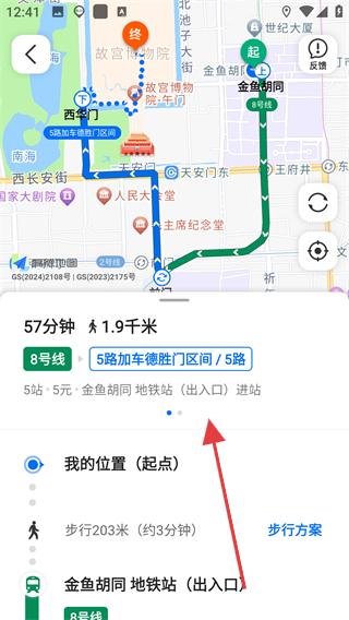3、進入路線規劃頁面,可選擇時間短、少步行等出行方式,查看公交換乘路線,如8號線轉5路加車德勝門區間5路,了解行程時間和距離。