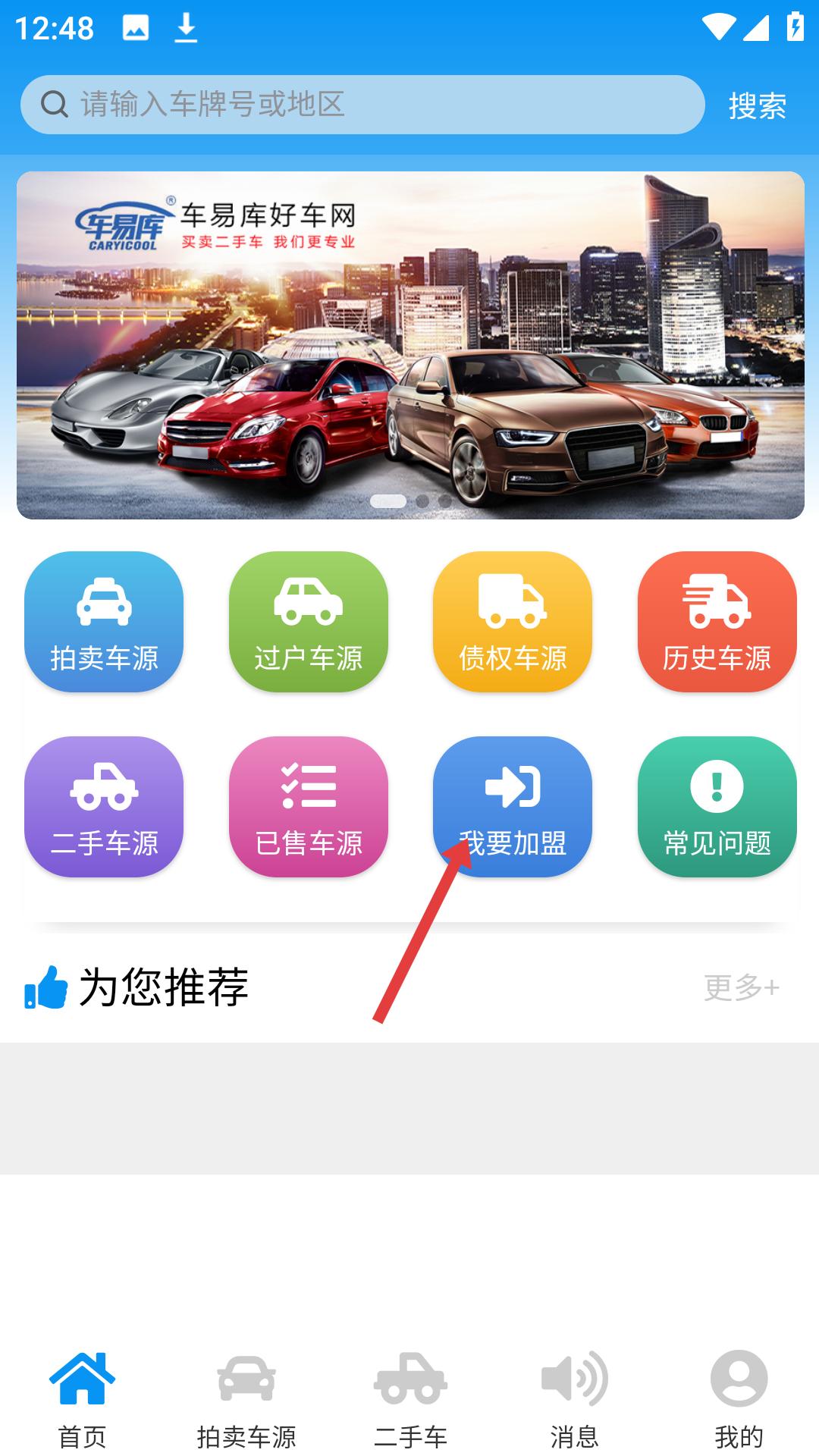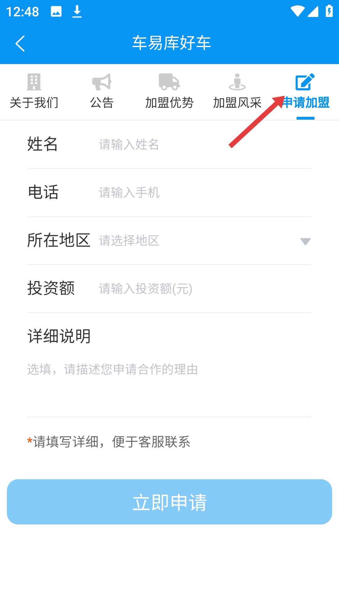 1、在車易庫好車網首頁,點擊我要加盟選項,可進入加盟申請頁面,開始填寫加盟信息。
