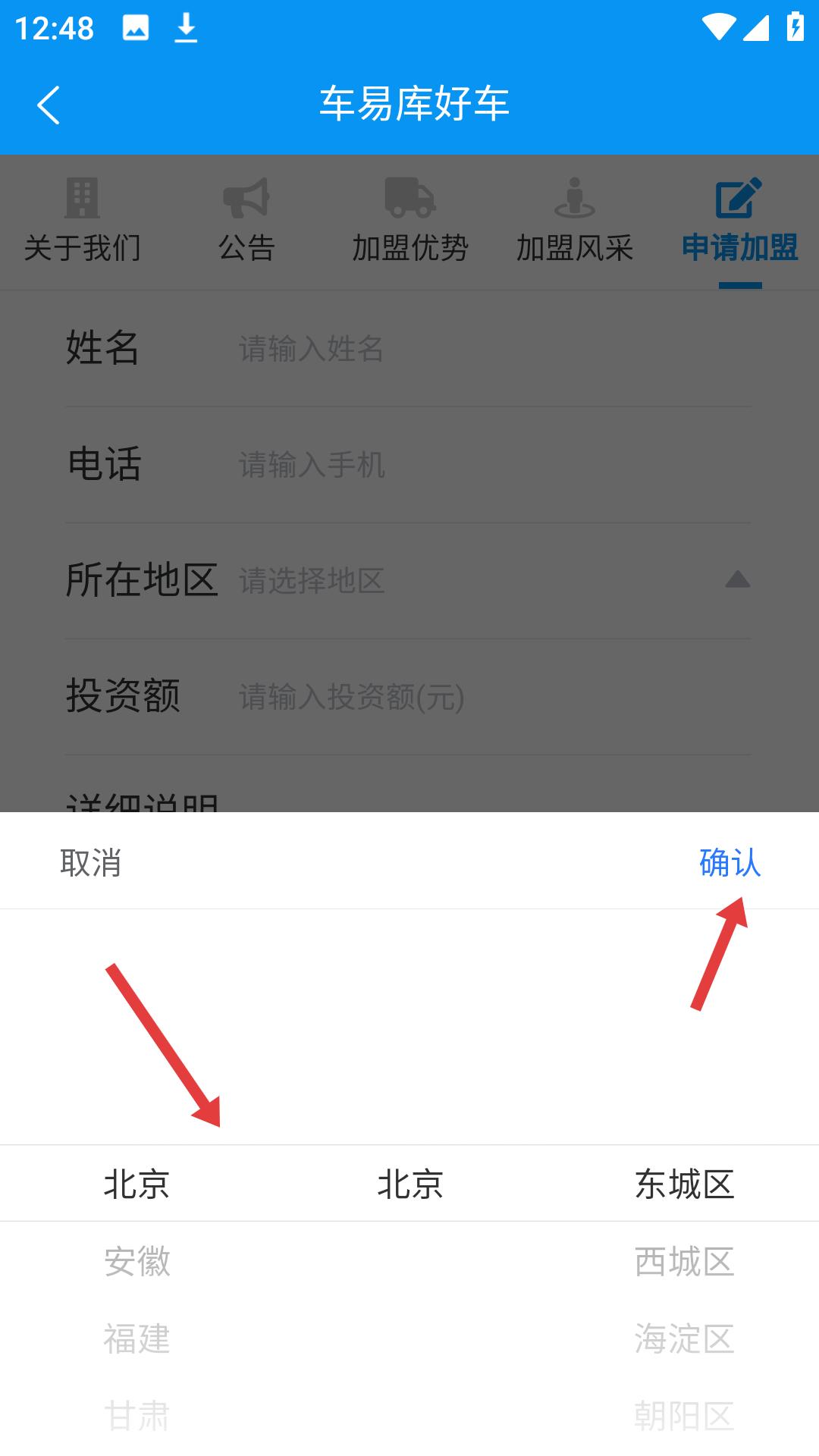 4、在所在地區選擇界面,選擇對應的省、市、區,點擊確認按鈕,完成所在地區的選擇,繼續填寫其他加盟信息。