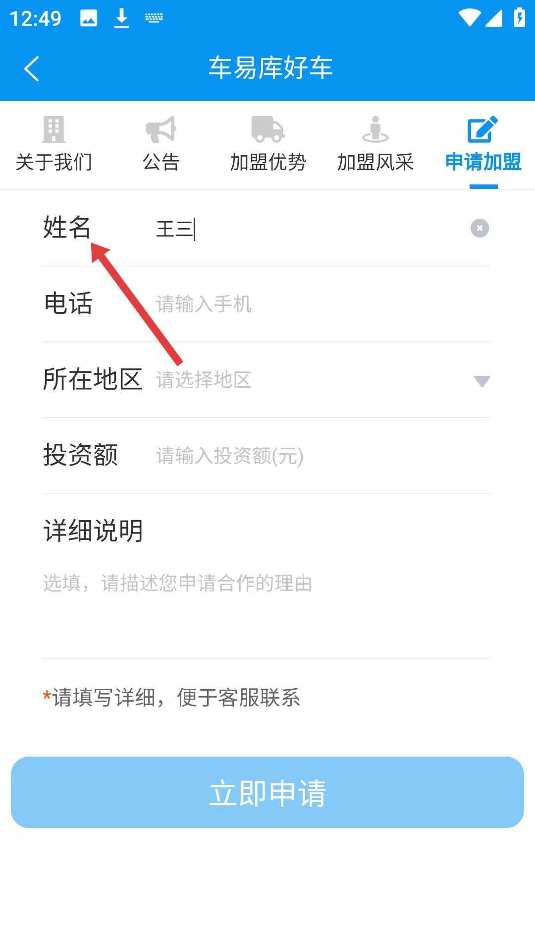 2、進入加盟申請頁面后,點擊申請加盟選項,可開始填寫姓名、電話、所在地區等加盟信息。