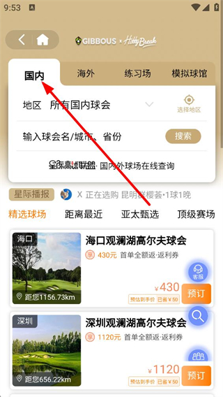 2、高爾夫訂場板塊,可選擇國內、海外、練習場、模擬球館分類,能搜索球會名、城市、省份,查看精選球場如??谟^瀾湖高爾夫球會等的預訂信息。