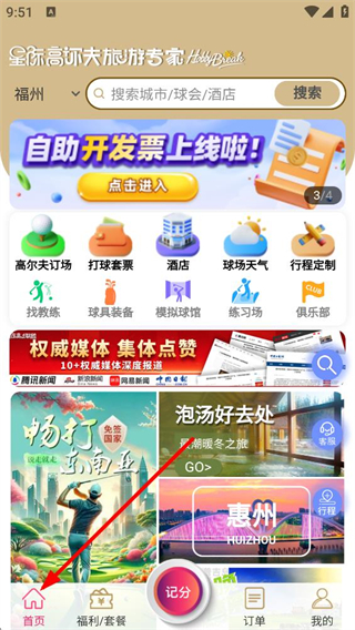 1、星際高球聯盟預訂首頁,有訂場、每日秒殺等功能模塊,還推送旅游相關資訊,底部首頁按鈕可返回主頁。