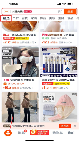 1、首頁精選頁,展示多品類商品,含食品、個護等,標注券后價、銷量等,設淘寶秒殺入口,支持搜索,是商品瀏覽的核心入口。