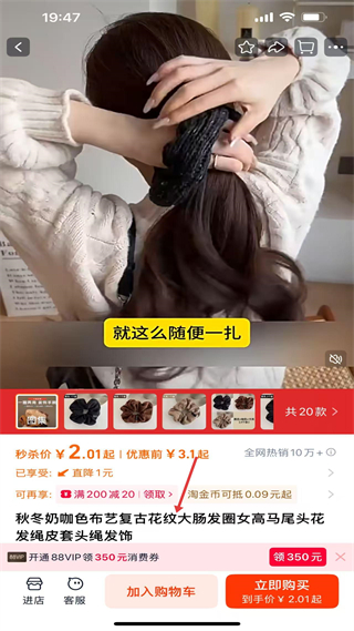 2、商品詳情頁,展示大腸發圈使用場景,標注秒殺價、優惠,提供20款選擇,設加購、購買按鈕,便于用戶下單選購。