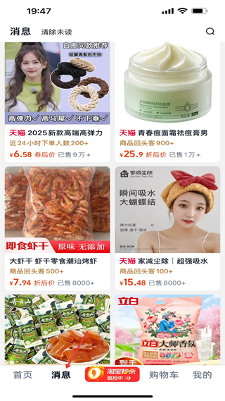 3、消息頁,推送發圈、祛痘膏等商品推薦,標注價格、銷量,幫助用戶及時獲取優惠商品的信息。