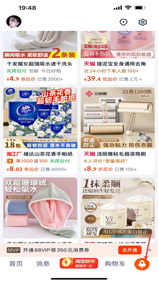 4、個人中心關聯頁,展示干發帽、手帕紙等商品,標注券后價、銷量,設先用后付服務,助力用戶便捷選購日常用品。