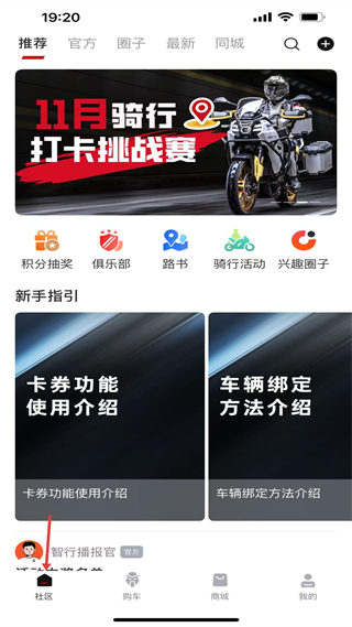 1、社區界面,有11月騎行打卡挑戰賽,提供積分抽獎等功能及新手指引,用戶可參與騎行活動、交流心得。