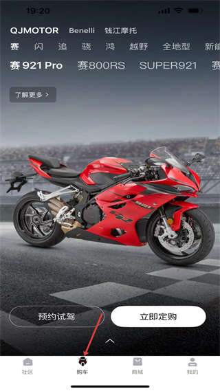 2、購車界面,展示QJMOTOR等品牌摩托車,如賽921Pro等,可預約試駕或立即定購,為用戶選購摩托車提供渠道。