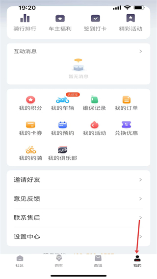 4、個人中心界面,有騎行排行等功能,可管理積分、車輛等,還能參與活動、反饋意見,滿足騎行及賬號管理需求。