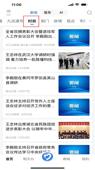 2、APP首頁,有推薦、時政等頻道,展示濕地上的城市,這就是武漢等新聞,可切換頻道瀏覽。