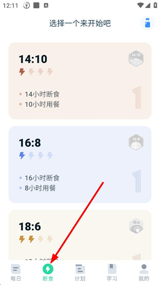2、點擊斷食板塊,可選擇14點10分、16點8分、18點6分等不同斷食模式,根據自身情況挑選適合的斷食計劃。