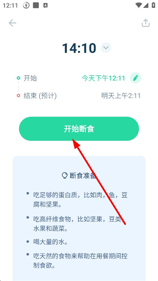3、選定斷食模式后,查看斷食開始和預計結束時間,閱讀斷食準備建議,點擊開始斷食即可啟動斷食進程。