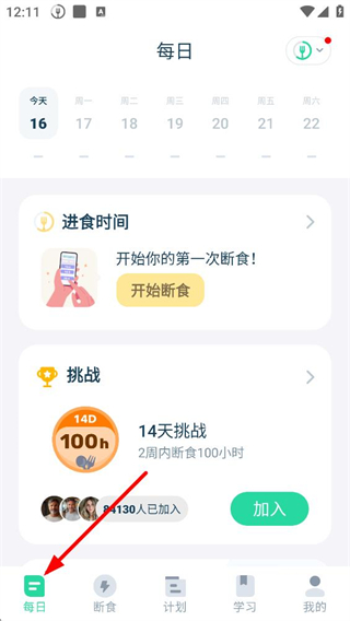 1、進入每日界面,可查看日期,參與進食時間斷食活動,還能加入14天斷食挑戰,開啟健康管理之旅。