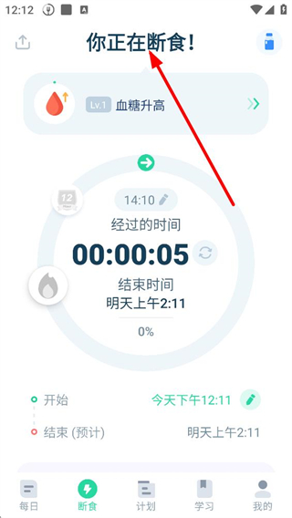 4、開始斷食后,界面顯示你正在斷食,實時記錄經過的時間和結束時間,還能查看血糖升高等級,直觀了解斷食狀態。