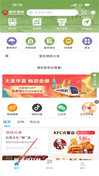 1、首頁,有乘車碼、線網圖等功能入口,還有便民雨傘、失物招領等服務,下方有地鐵資訊和推薦內容。