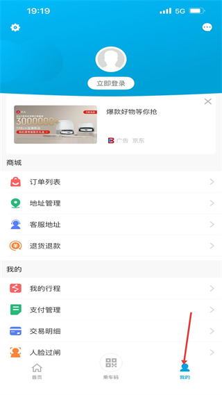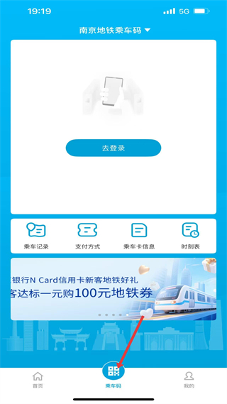 3、乘車碼頁,展示乘車碼需登錄,還有乘車記錄、支付方式等輔助功能,下方有地鐵券活動廣告。