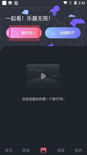3、進入比優視頻APP,在底部導航欄點擊探索板塊,于該板塊界面中找到隨機進入按鈕并點擊,進入隨機匹配的影廳。