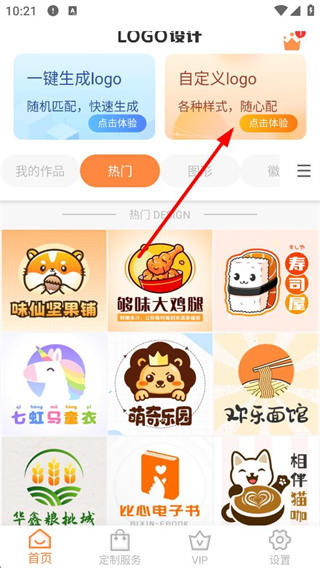 1、LOGO設計頁面,選擇自定義logo功能,該功能支持自由搭配樣式,點擊體驗后進入Logo編輯界面,可開展個性化設計操作。