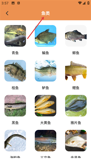 3、魚類分類動物卡列表,包含青魚、鯉魚等常見魚類的形象與名稱,輔助兒童認識不同魚類形態特點,助力魚類知識啟蒙學習。