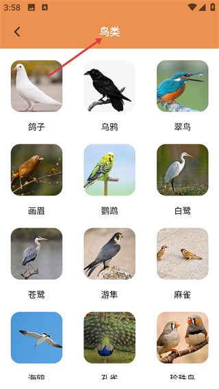 4、鳥類分類動物卡列表,展示鴿子、翠鳥等鳥類的形象與名稱,幫助兒童區分不同鳥類外形差異,是鳥類認知專題學習入口。