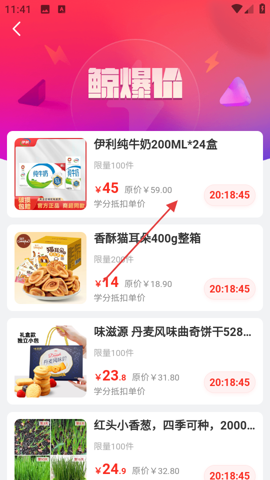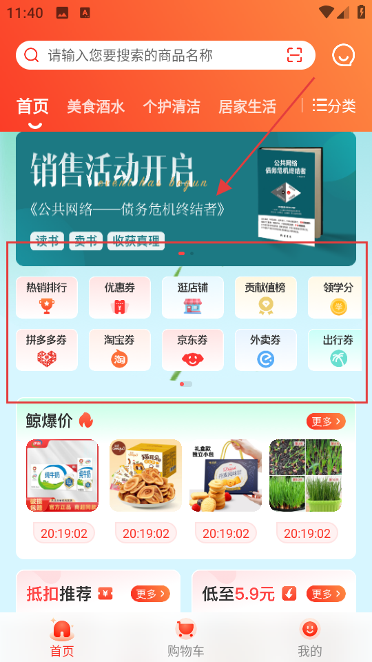 1、打開購物APP,在首頁瀏覽功能區,找到鯨爆價等優惠板塊入口,點擊進入,查看各類優惠商品信息。