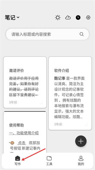 1、酷記事寫作頁面,可搜索筆記標題或內容,有邀請評價、軟件介紹、使用幫助等筆記卡片,底部寫作入口方便進入記錄。