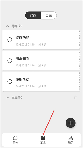2、工具頁面分代辦、目錄標簽,代辦下有待完成的待辦功能、側滑刪除等事項,能清晰管理待辦任務。