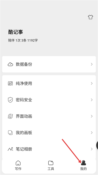 4、我的頁面顯示酷記事陪伴次數、筆記數與字數,有數據備份、純凈使用等功能選項,可進行個性化設置。