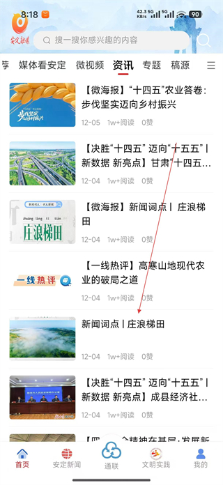 2、登錄成功后進入資訊板塊,瀏覽資訊列表,選擇新聞詞點莊浪梯田,點擊進入該資訊的詳情頁面。