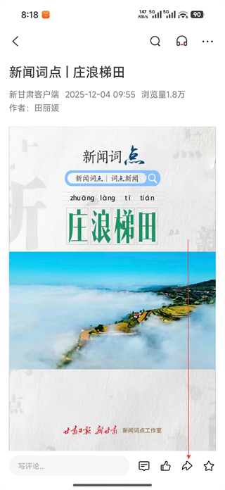 3、在資訊詳情頁閱讀關于莊浪梯田的內容,找到頁面底部的分享按鈕,點擊彈出分享選項界面。