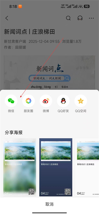4、在分享界面中選擇微信登選項,即可將這篇莊浪梯田的資訊內容分享到到微信的好友。