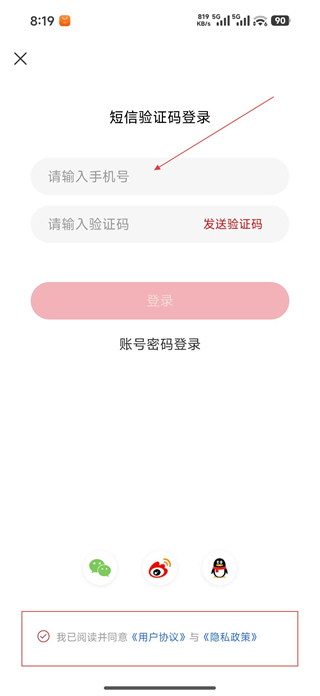 1、打開軟件進入短信驗證碼登錄頁面,填寫手機號并勾選協議,點擊發送驗證碼后填入對應框,點擊登錄完成賬號登錄。
