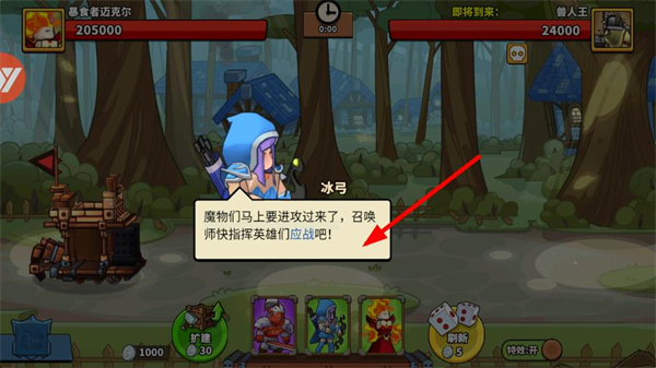 1、魔物進攻前,召喚師需指揮英雄應戰,如冰弓等英雄準備迎敵,開啟塔防戰斗之旅。