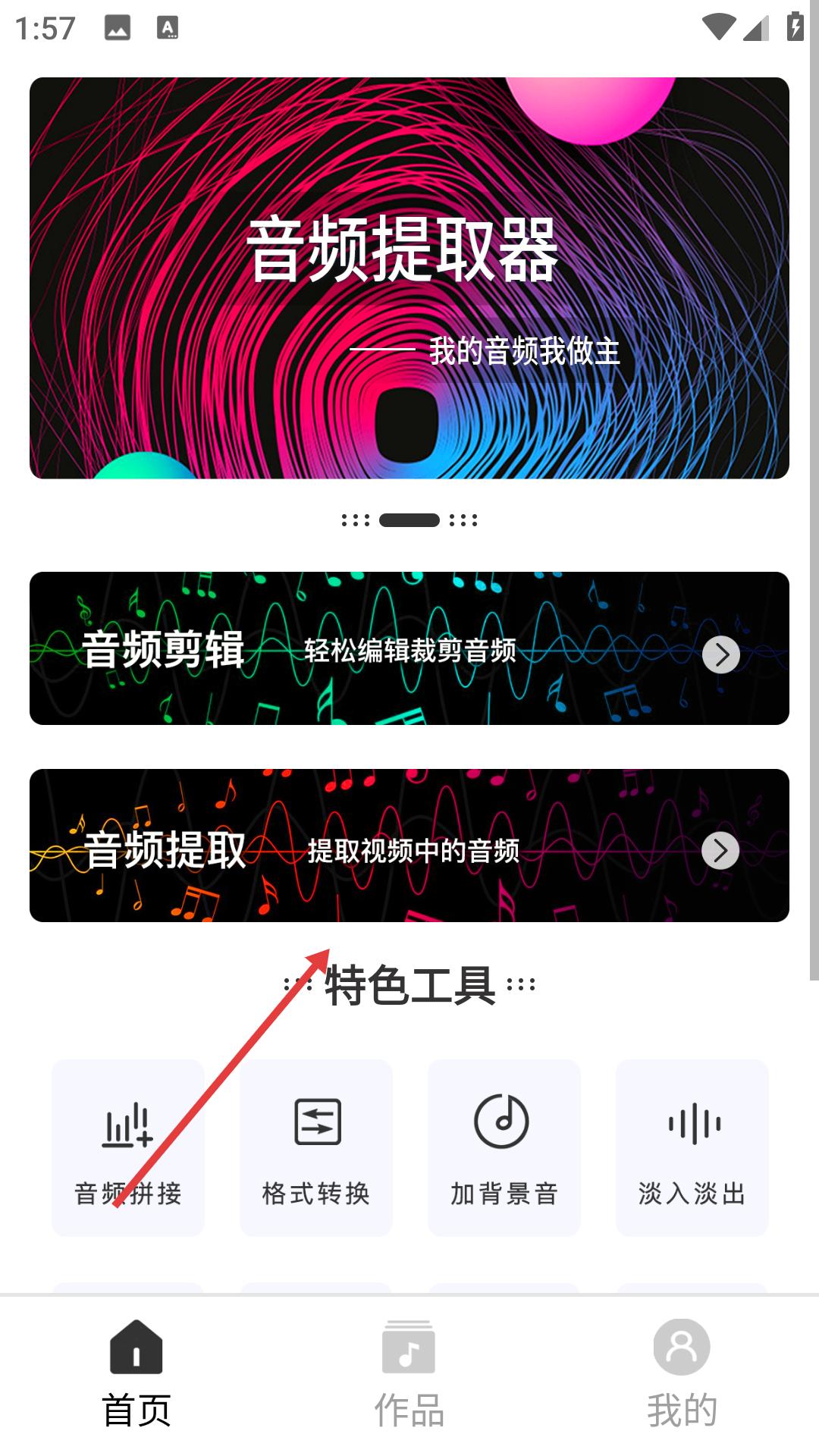 2、在音頻提取器首頁有音頻剪輯、音頻提取等功能入口,還有音頻拼接、格式轉換等特色工具,方便用戶處理音頻。