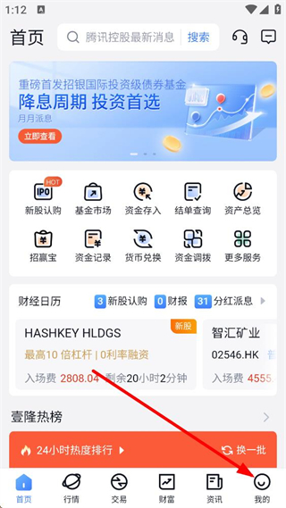 1、進入壹隆環球首頁,含新股認購基金市場等功能入口,還有財經日歷壹隆熱榜等板塊,點擊底部我的選項進入對應頁面。