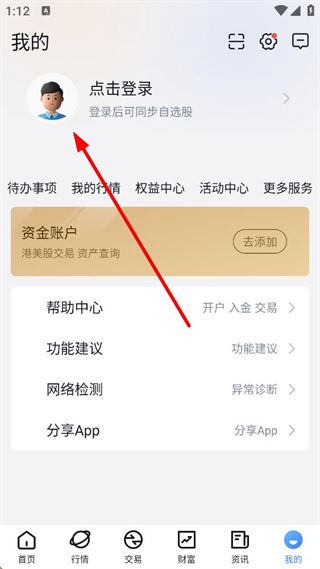 2、進入我的頁面,呈現點擊登錄狀態,含待辦事項資金賬戶等板塊,還有幫助中心等功能選項,點擊登錄進入注冊、登錄界面。