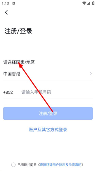 4、進入國際手機號注冊、登錄頁面,先選擇對應國家、地區,輸入手機號信息,完成后點擊注冊、登錄按鈕推進操作。