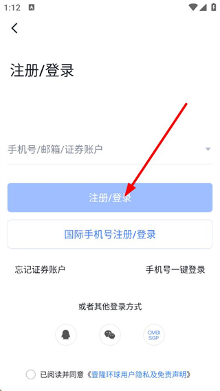 3、進入注冊、登錄頁面,可填寫手機號郵箱或證券賬戶,設國際手機號注冊、登錄選項,也能選擇其他第三方登錄方式。