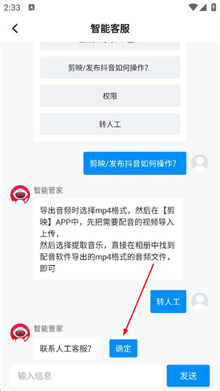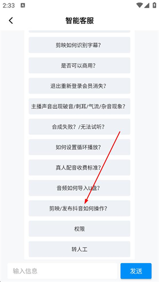 2、在智能客服頁面查看常見問題列表,選擇剪輯發布抖音如何操作的問題,獲取對應的操作指引。