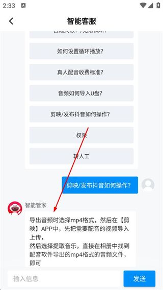 3、查看智能管家給出的操作步驟,了解導出音頻格式及在剪輯APP中導入視頻、提取音的方法。