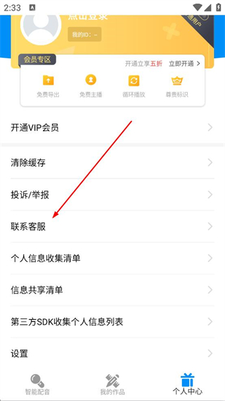 1、打開軟件進入個人中心頁面,瀏覽開通會員清除緩存等選項,選擇聯系客服,進入智能客服界面。
