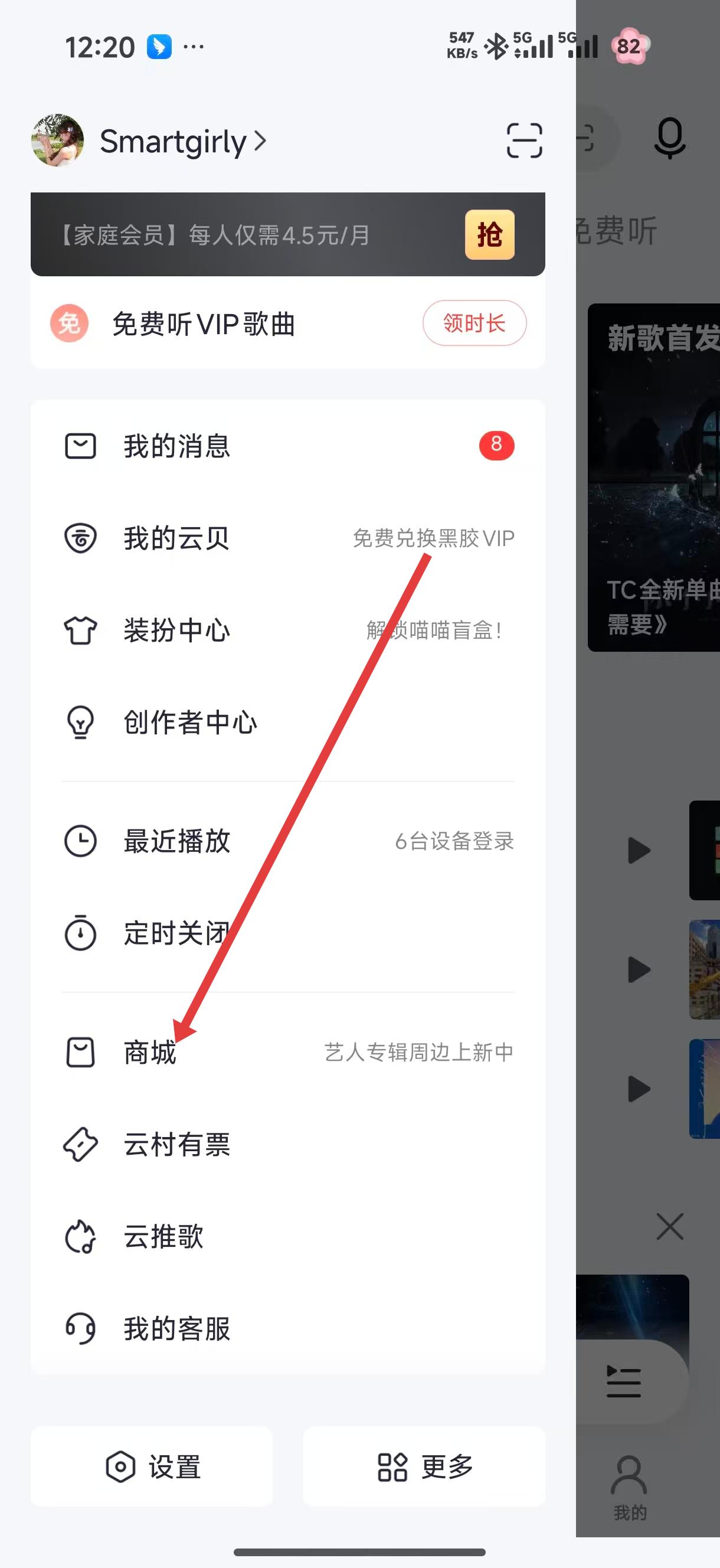 1、打開網易云音樂APP,進入個人相關界面,找到商城選項,點擊該選項,進入網易云音樂商城頁面。