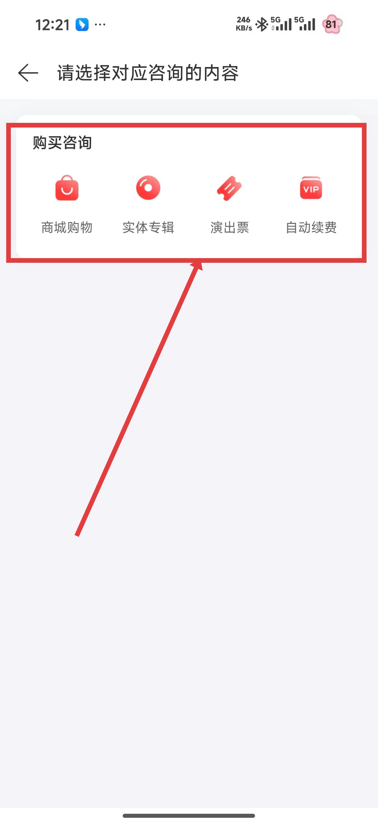 4、若在購買過程中有疑問,進入咨詢選擇頁面,根據需求選擇對應的咨詢內容,如商城購物、實體專輯等進行咨詢。