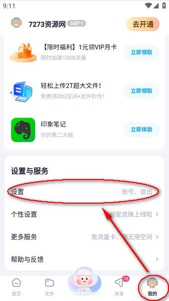 1、打開應用,點擊底部導航欄我的選項,進入個人頁面,在個人頁面的設置與服務板塊,找到設置選項并點擊,進入設置界面。