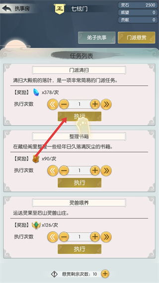 1、在執事房可接取門派清掃等任務,調整執行次數后點擊執行,完成任務獲取獎勵,提升門派貢獻。