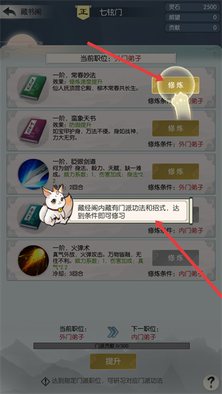 2、在藏書閣可修煉門派功法,如常規妙法等,滿足修煉條件后點擊修煉,提升自身修仙實力。