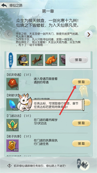 4、完成修仙之路的任務,如初次奇遇等,點擊領取可獲取獎勵,推進修仙劇情,豐富游戲體驗。